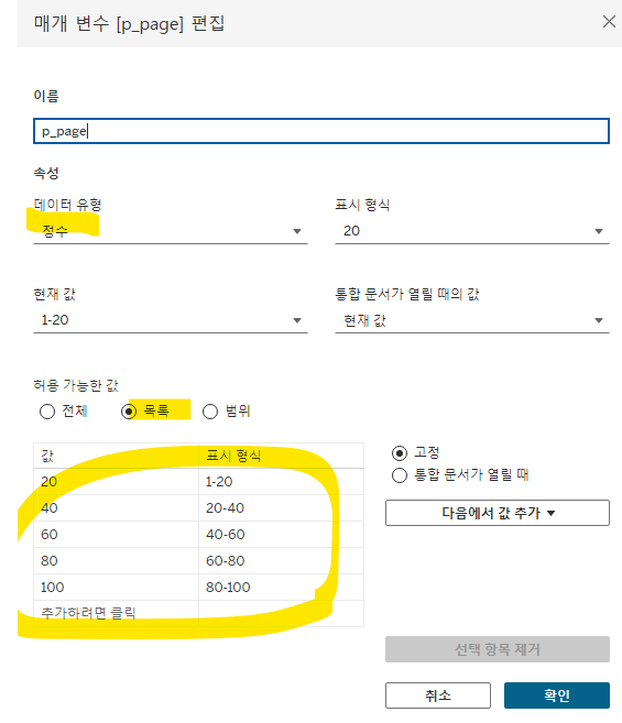 (사진에선 표시 형식이 20-40, 40-60... 이라고 되어있는데, 21-40, 41-60으로 바꿔주기)