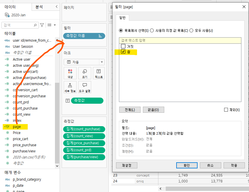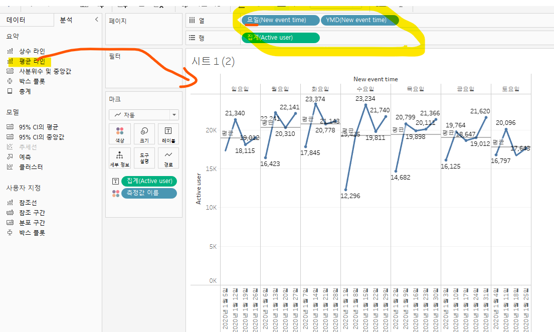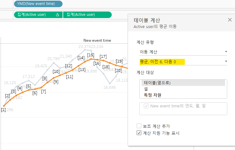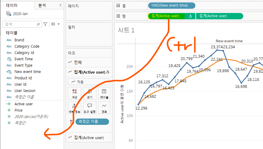 이동평균 설정한 데이터 필드를 데이터 패널로 복제하기 (Ctrl 누른 채로 드래그&드랍)