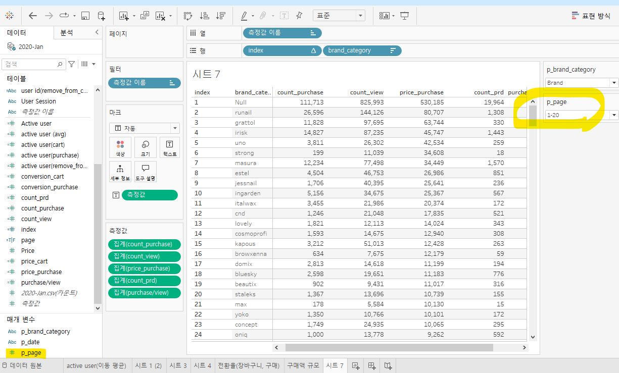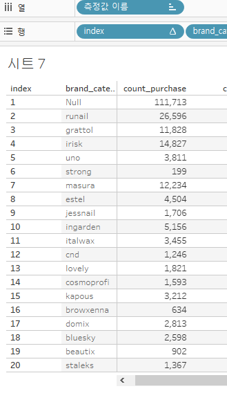 (1) brand 컬럼에 대고 마우스 오른쪽 클릭 > 정렬 클릭