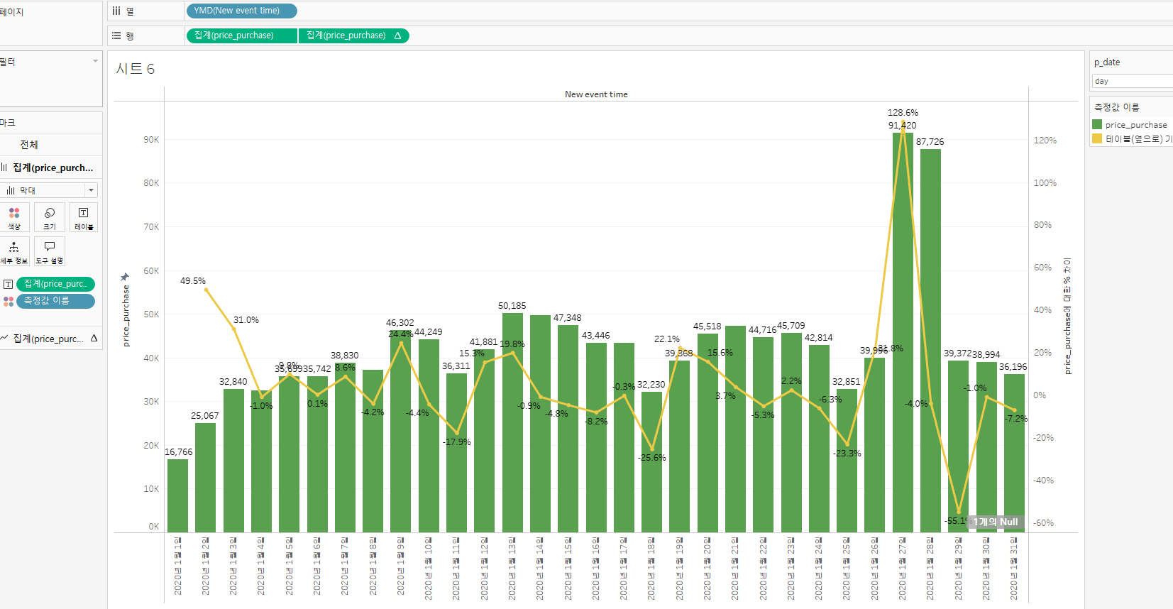 이중축한 후에, 구매액 라인그래프는 막대 그래프로 변경해주기