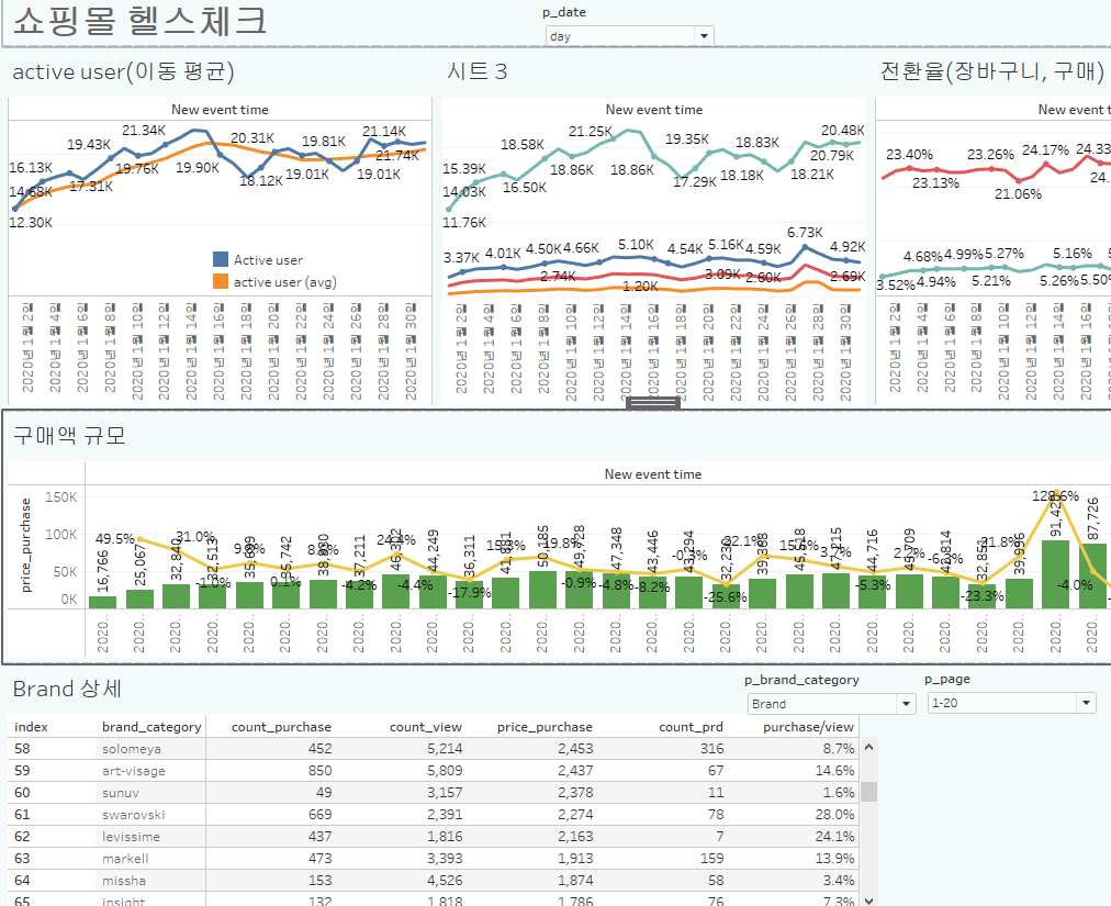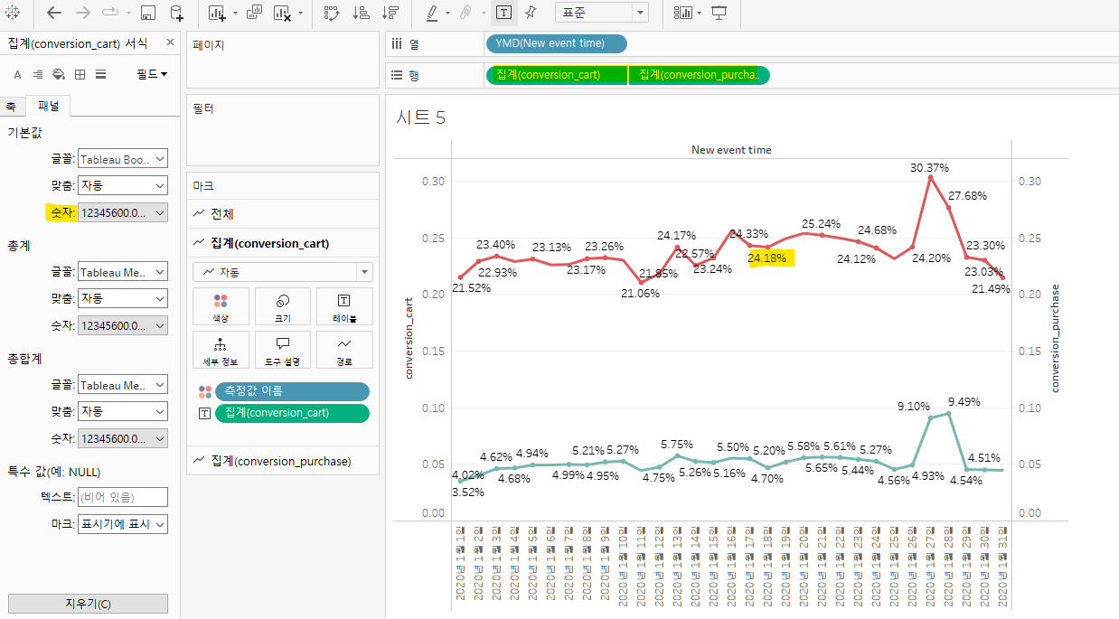 행에 cart 전환율, purchase 전환율 올려주고 이중축 + 레이블 서식 백분율로 수정해주기