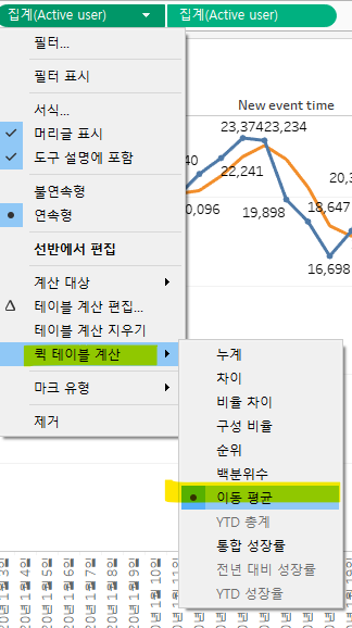 선반에 올린 필드에 마우스 오른쪽 클릭 > 퀵 테이블 계산 > 이동 평균 선택