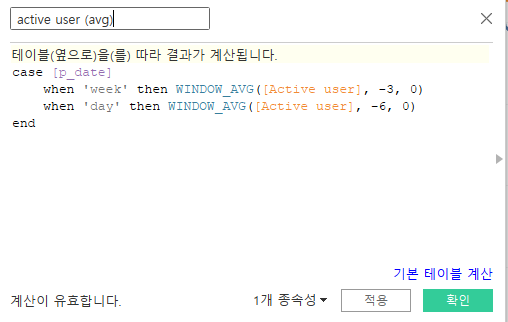 필드에 마우스 오른쪽 클릭 > 테이블 계산 편집 누르면 기간 설정할 수 있음.