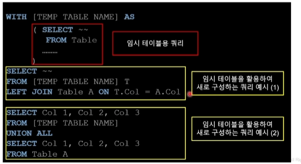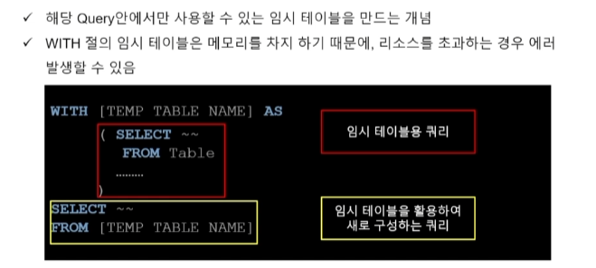 주의사항 ! WITH로 만든 임시 테이블은 메모리를 차지함. (전체 쿼리가 끝나면 메모리에서 내려가지만, 임시 테이블을 사용할 때에는 당연히 메모리를 차지하기 때문에 리소스적으로 주의가 필요하다고 함)