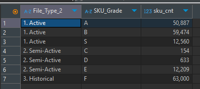 SELECT File_Type_2 , SKU_Grade , count(DISTINCT SKU_number) AS sku_cnt
