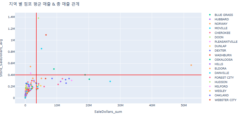 x = "SaleDollars_sum", y = "Store_SaleDollars_avg", color = 'City', hover_data = ['City'])