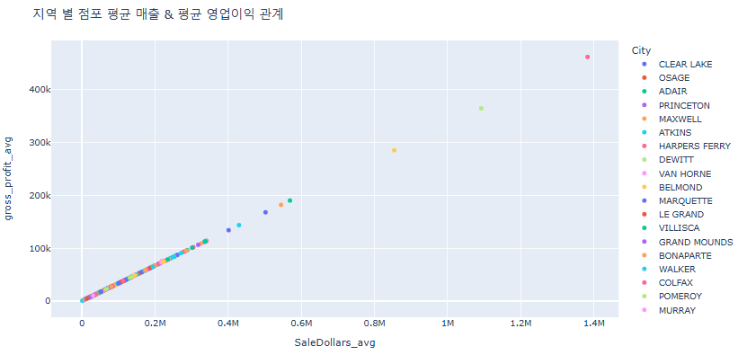 x = "SaleDollars_avg", y = "gross_profit_avg", color = 'City', hover_data = ['City'])