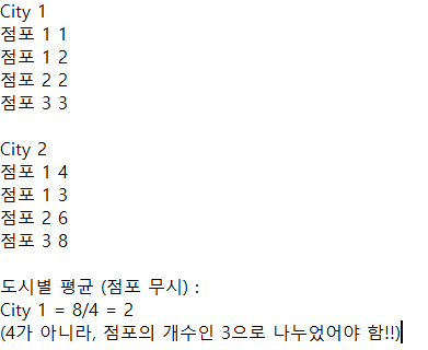 City1의 점포는 3개인데 데이터가 4개라서, 평균을 3이 아니라 4로 나누게 되고,