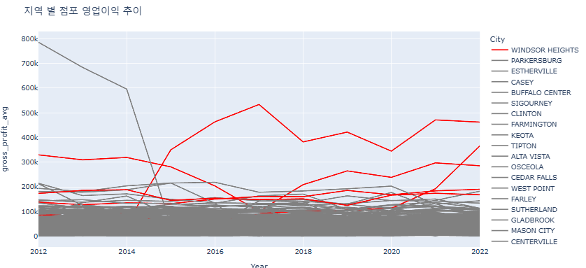 x = "Year", y = "gross_profit_avg", color = 'City',hover_data = ['City'],
