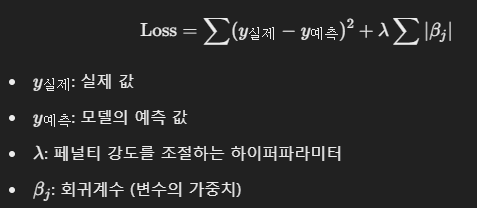 Lasso모델은 손실 함수에 계수들의 절댓값 합을 페널티로 추가합니다.