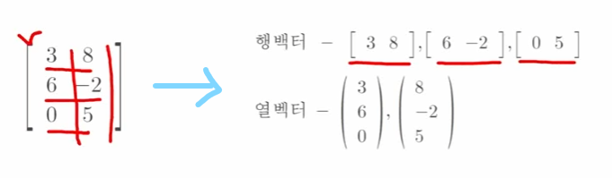 - 행은 가로로 가는 벡터라고 볼 수 있고, 열은 세로로 가는 벡터라고 볼 수 있다고 함