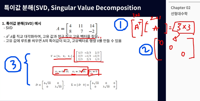 3️⃣ : V는 A의 고유벡터로 만든 행렬, D는 A의 특이값으로 만든 대각행렬, 시그마는 행렬 D에 빈 값을 추가하여 행렬 A의 형태에 맞춘 값 이라고 보면 됩니다.