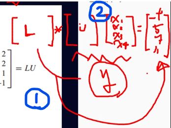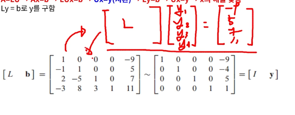 L은 대각성분이 1이므로, L행렬과 b값을 통해 L행렬의 가장 윗 행부터 y1, y2, y3, y4값을 쉽게 구할 수 있음