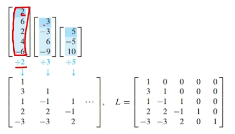 첫 번째 열을 0으로 만들기 전의 (2 6 2 4 -6)에, 첫 번째 요소인 2를 나눠주면 L의 첫 번째 열이 나오고,