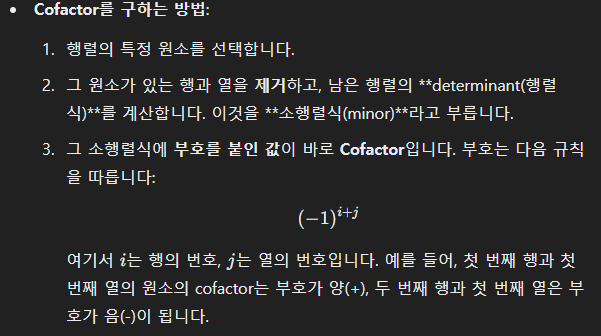 Cofactor(여인수) 는 행렬의 특정 원소에 해당하는 값으로, 그 원소가 행렬의 행렬식(determinant)에 미치는 영향을 계산하는 도구라고 생각하면 됩니다.