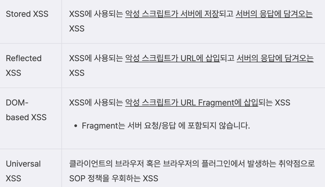 XSS는 이용자가 삽입한 내용을 출력하는 기능에서 발생합니다. 에를들면 로그인 시 출력되는 "안녕하세요, 00회원님"과 같은 문장에서 말입니다. XSS의 종류는 발생 형태에 따라 구분되며, 아래의 내용을 확인해주세요.