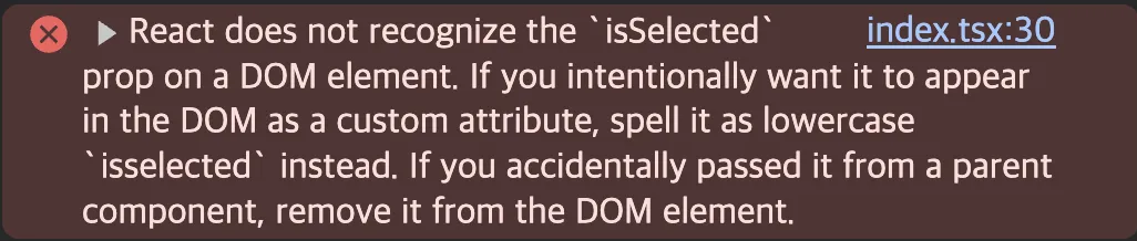 React + styled-components로 사이드바를 개발하는 과정에서 커스텀 prop(예: boolean, string 등)을 DOM에 그대로 넘겨 두 개의 경고 메시지를 마주치게 되었다.