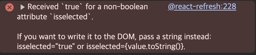 - React는 해당 prop을 custom attribute로 DOM에 전달하고, boolean 값이 전달되면 아래와 같은 경고를 출력한다.
