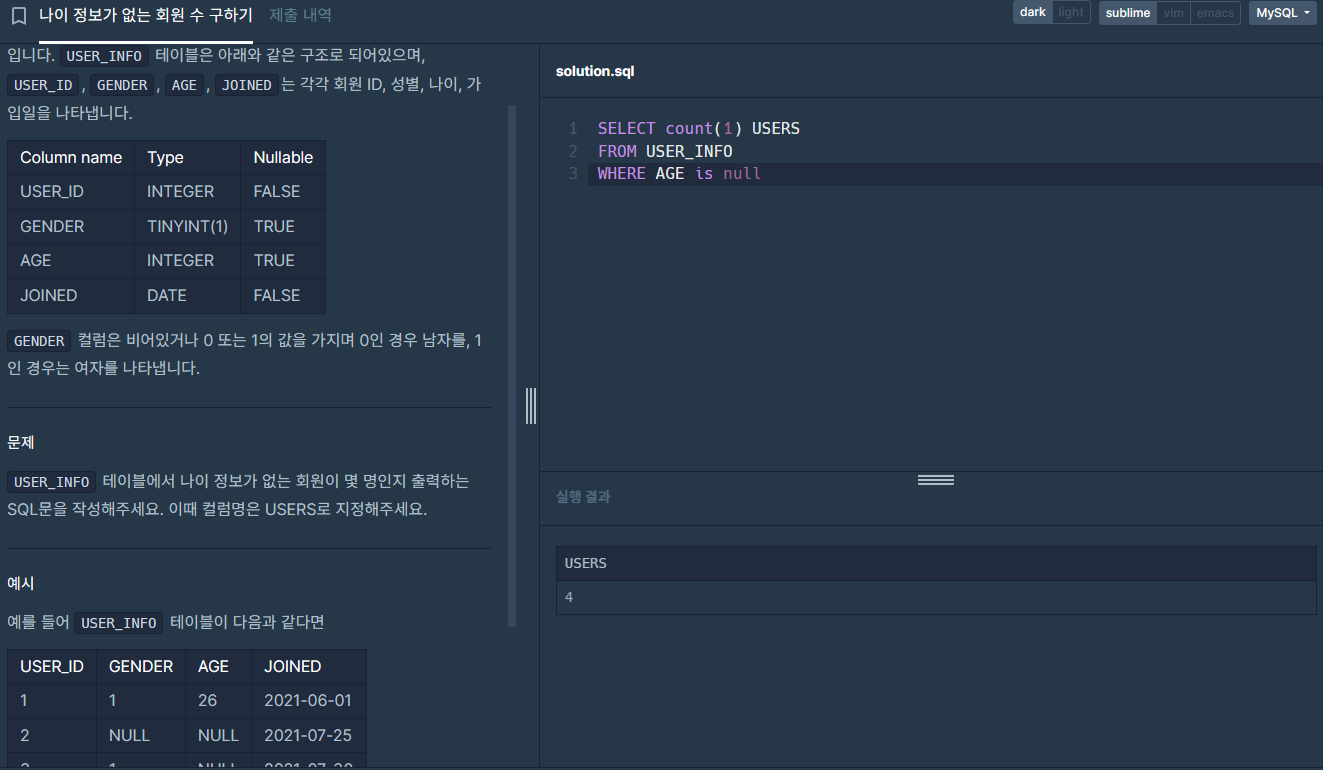 회원의 수를 count(1) 함수로 카운트 하고, 나이 정보가 없는 회원을 카운트하기 위해서 WHERE 절에 조건을 작성한다.