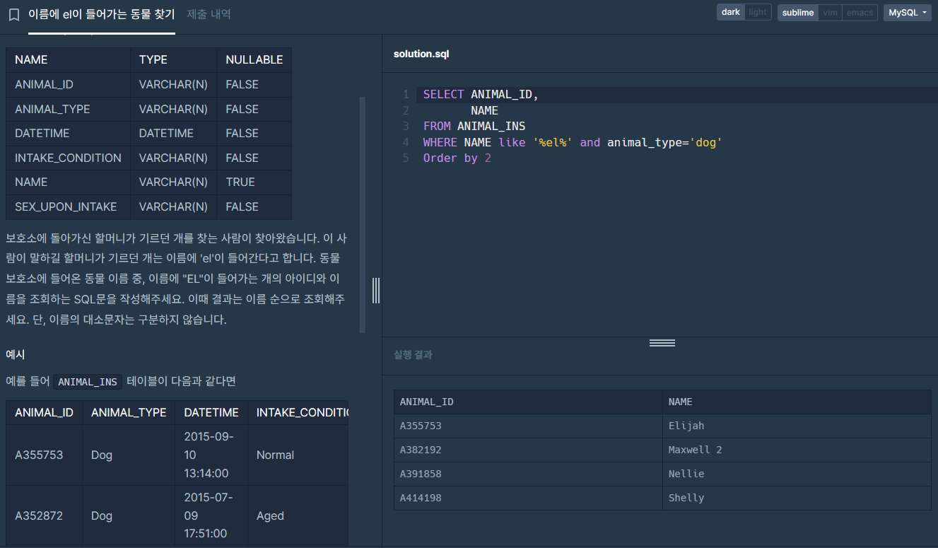 이름에 "EL"이 들어가는 "개"를 조회하는 조건을 WHERE절에 작성한다.
