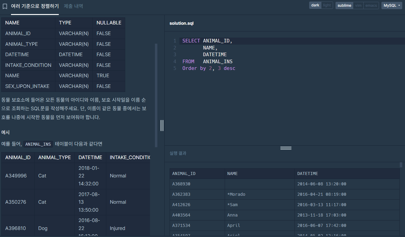 이름순으로 정렬 but 보호를 나중에 시작한 동물부터 정렬