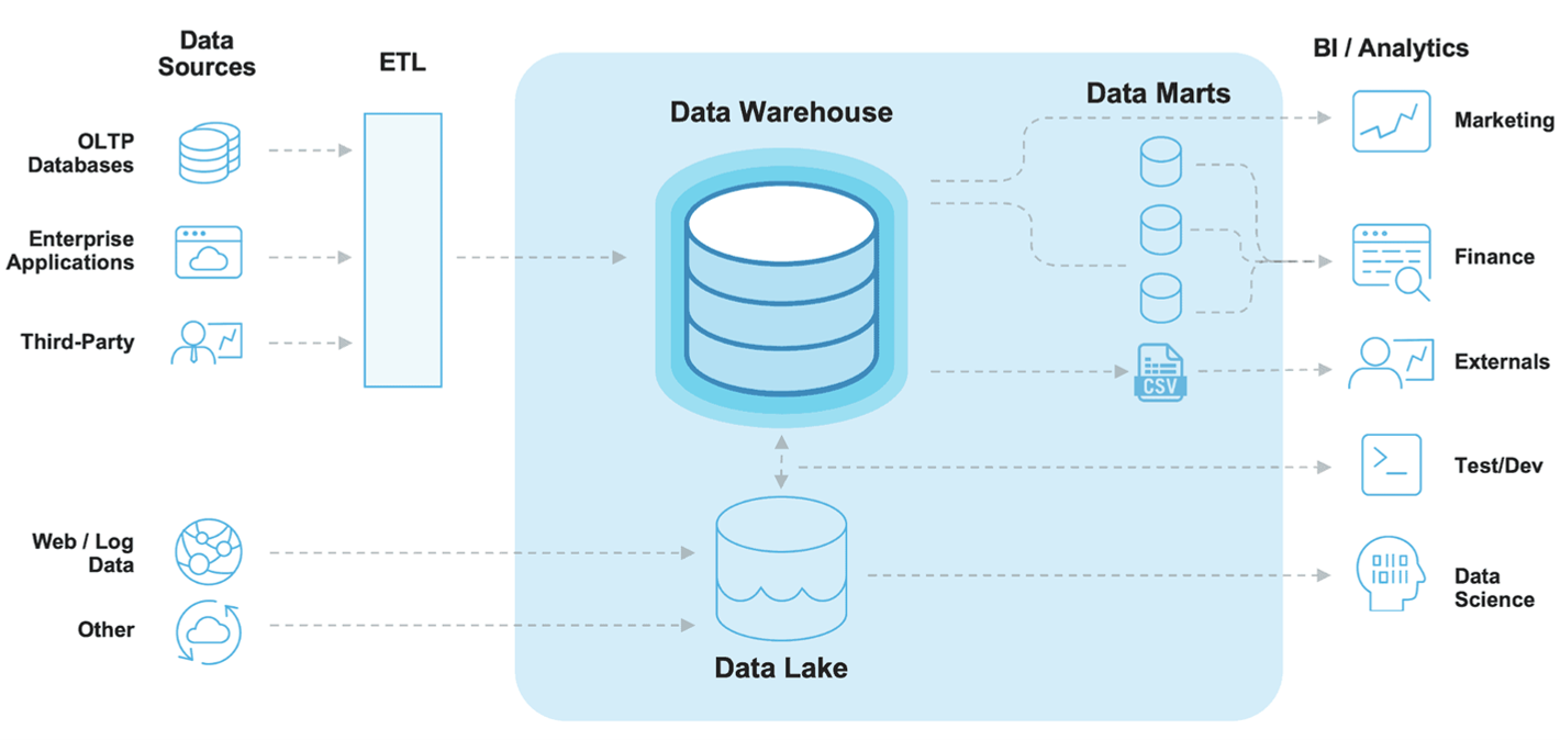 - Data Marts : Data Warehouse와 다르게 특정 조직의 목적을 위해 가공된 데이터 (ex. 회사의 금융, 마케팅, 영업부서 등에서 "저 이제 데이터 말겠습니다~")