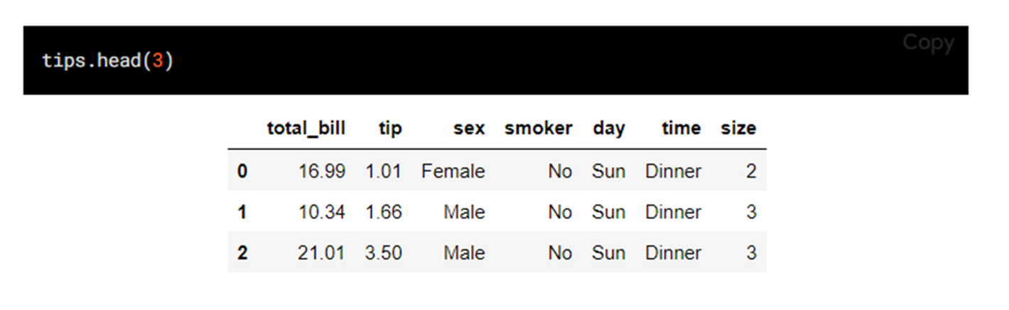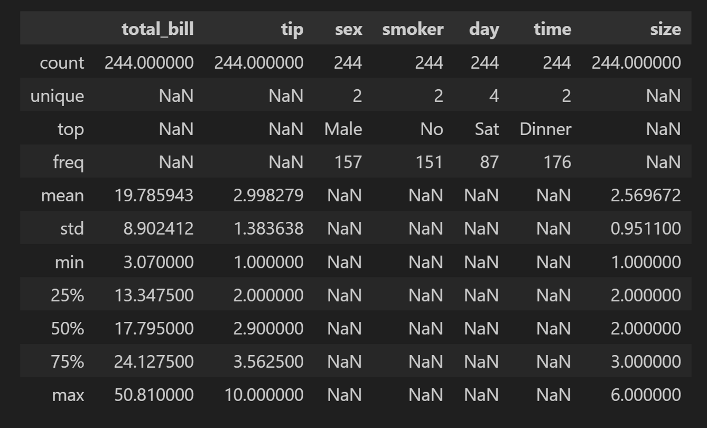 tips.describe()include='all' 옵션을 통해 범주형 데이터도 확인 가능