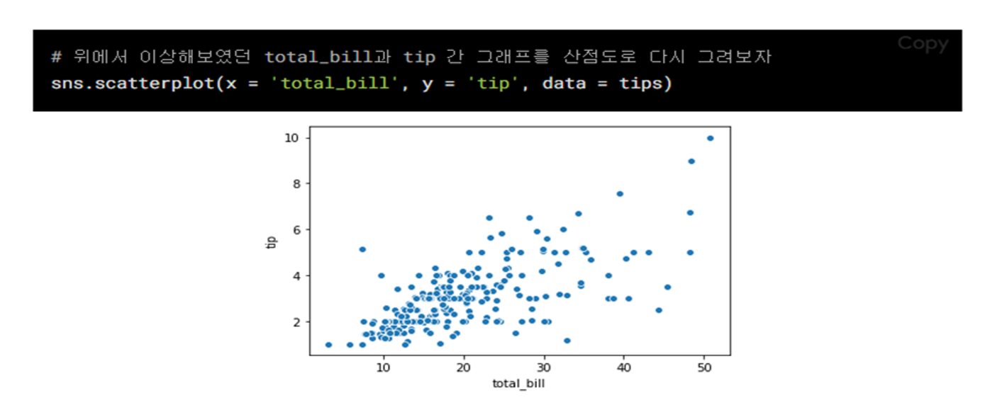 - 방법 : 두 연속형 변수간의 관계를 시각적으로 파악하고 싶을 때 (ex. 키와 몸무게 간의 관계를 나타낼 때)