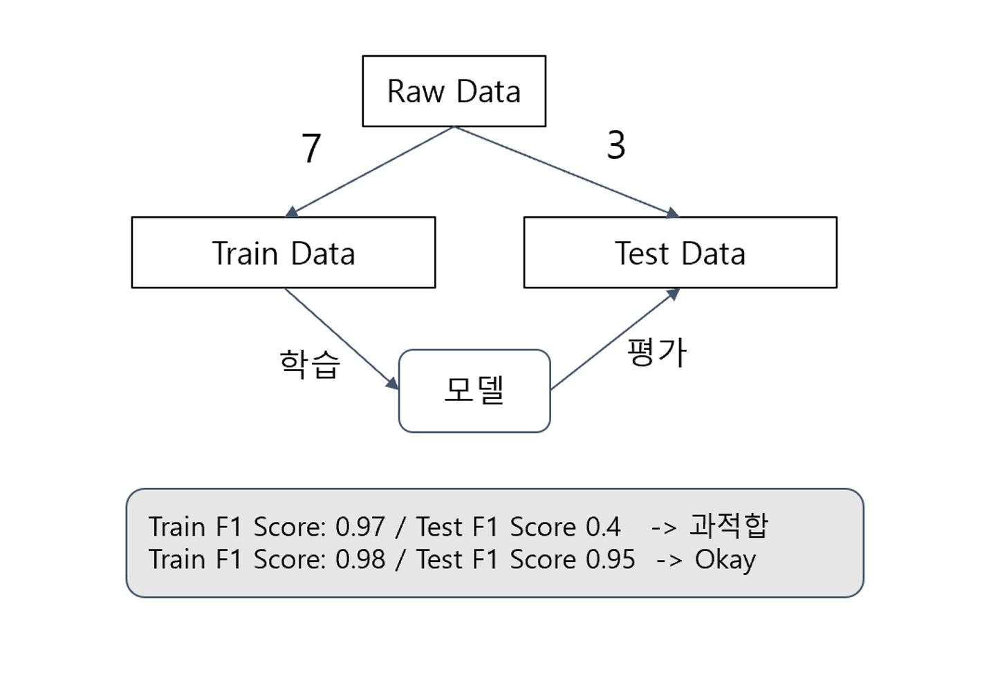 fit)하기 위한 데이터sklearn.model_selection.train_test_splittest_size : 테스트 데이터 세트 크기 (보통 3 or 2)train_size : 학습 데이터 세트 크기 (보통 7 or 8)shuffle : 데이터 분리 시 섞기random_state : 호출할 때마다 동일한 학습/테스트 데이터를 생성하기 위한 난수 값. 수행할 때 마다 동일한 데이터 세트로 분리하기 위해 숫자를 고정 시켜야함X_train : (ex. 전체의 70% 중 공부하는것의 70%),X_test : (ex. 전체의 30% 중 테스트하는것의 70%),y_train : (ex. 전체의 70% 중 공부하는것의 30%),y-test : (ex. 전체의 30% 중 테스트하는것의 30%)⚠️ Train Data에서 얻은 정보는 절대절대절대절대절대 Test Data에 적용하면 안됨.