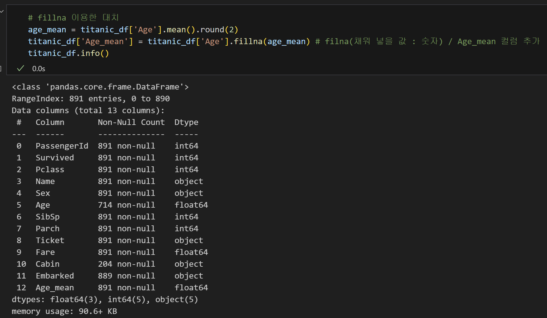 - df.fillna(value) : 특정 값으로 대치(평균, 중앙, 최빈값)