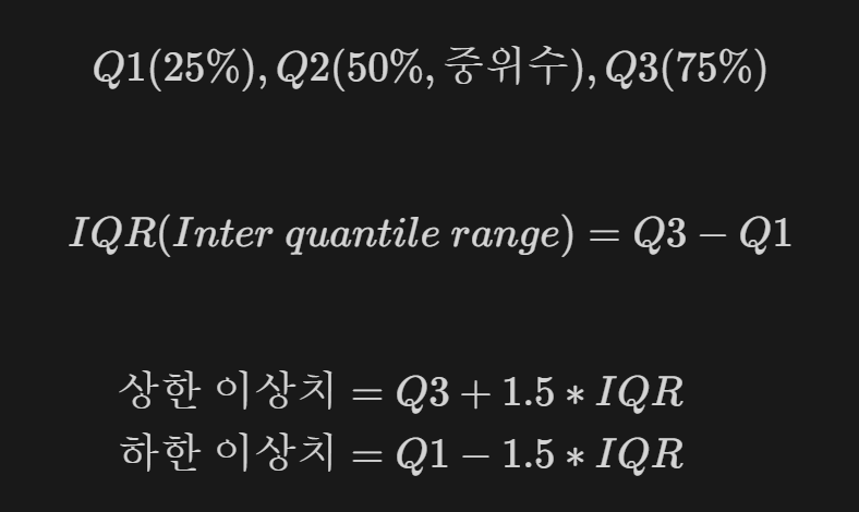 : 관측된 데이터 범위에서 많이 벗어난 아주 작은 값 혹은 큰 값. 크게 2가지 기준이 있다.