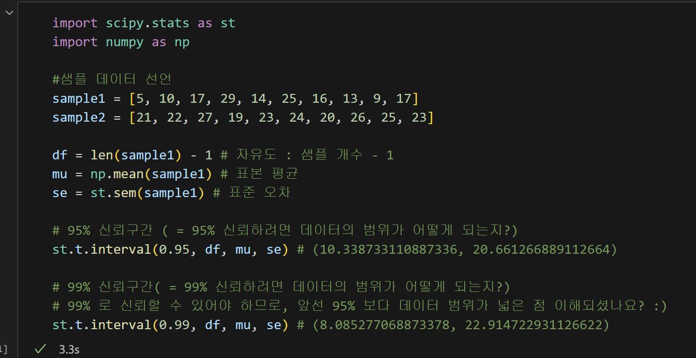 'scipy'를 활용하여 95%와 99%의 신뢰구간을 확인하면,
