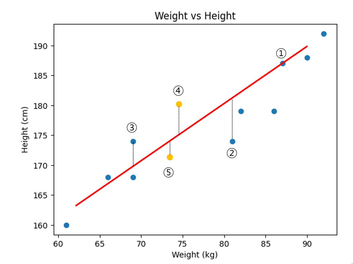 But❗ 선분을 기준으로 위에 있는 데이터의 거리를 계산하면 양수이지만, 아래에 있는 데이터는 음수가 된다. 이 경우, 모든 에러를 합치면 서로 상쇄되는 문제가 있었다. 따라서, 음수를 양수로 만들기 위해 제곱을 하는 방법이 있다는걸 생각해 냈다.