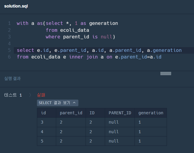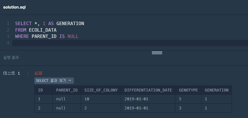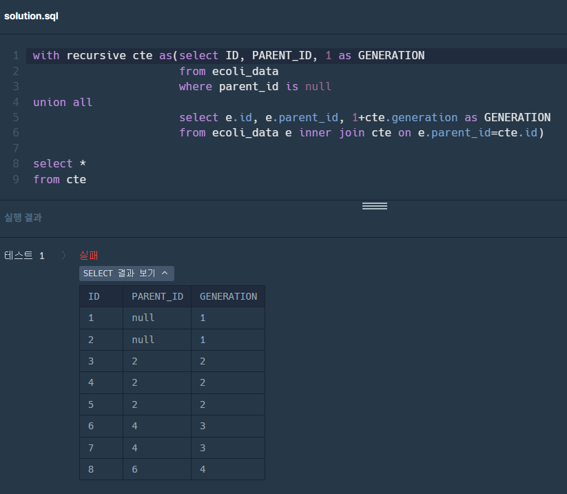 select id, generation, parent_id from cte where not id in (select distinct parent_id #여기서 distinct는 크게 상관 없다. from ecoli_data where parent_id is not null)
