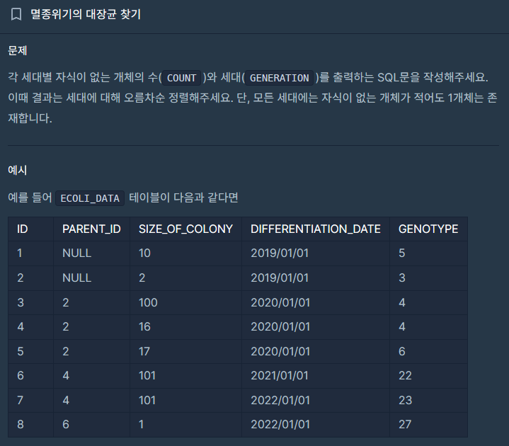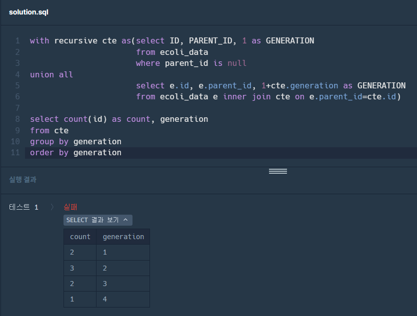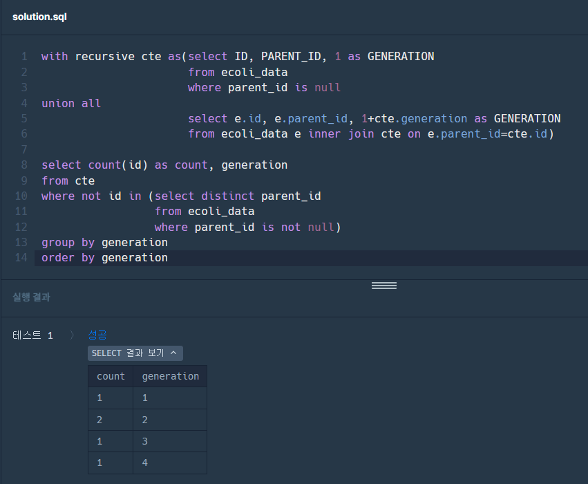 select count(id), generation from cte where not id in (select distinct parent_id #여기서 distinct는 count때문에 해야한다. from ecoli_data where parent_id is not null) group by generation order by generation;