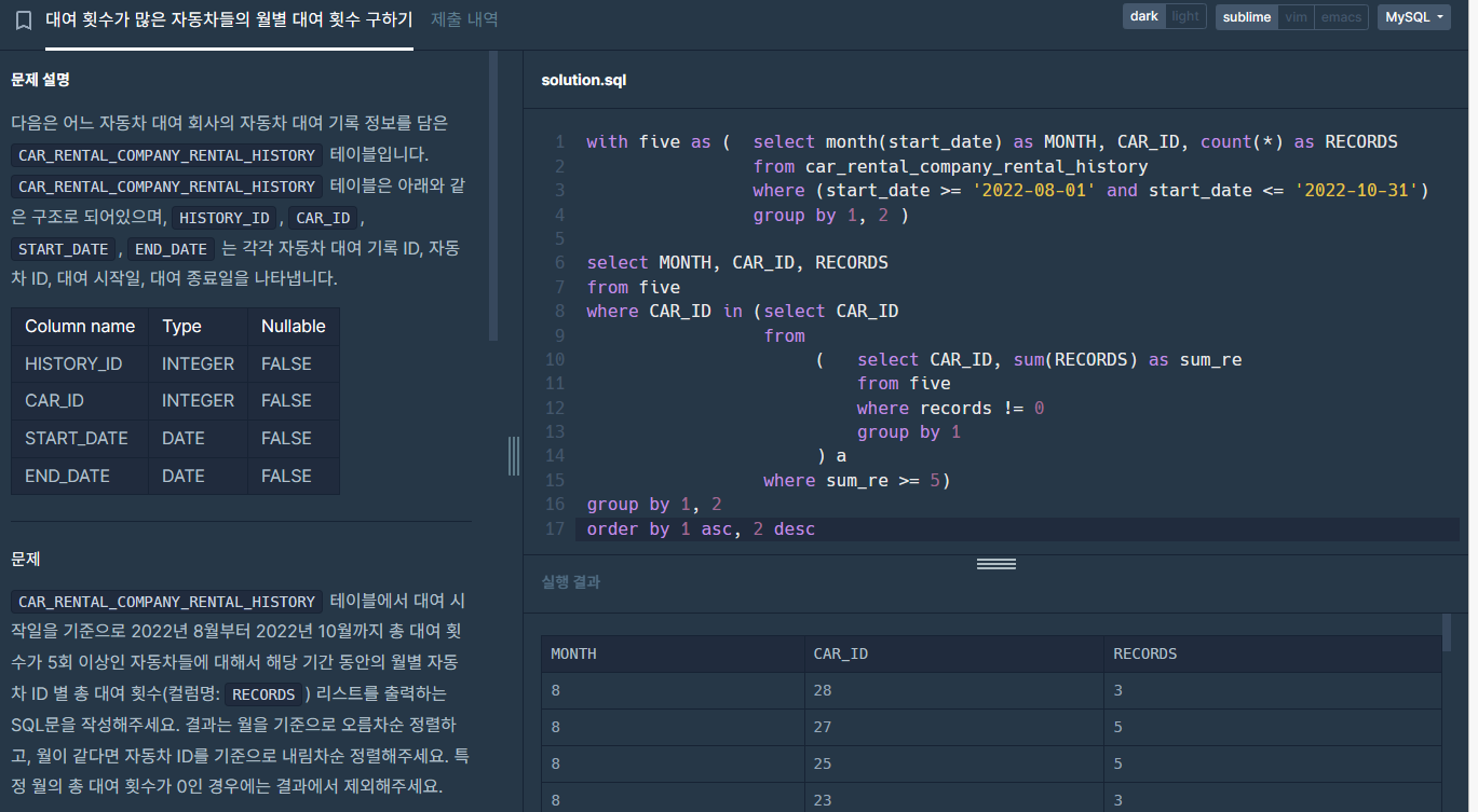 1. 2022년 8월부터 2022년 10월까지 월별 자동차별 총 대여 횟수 계산