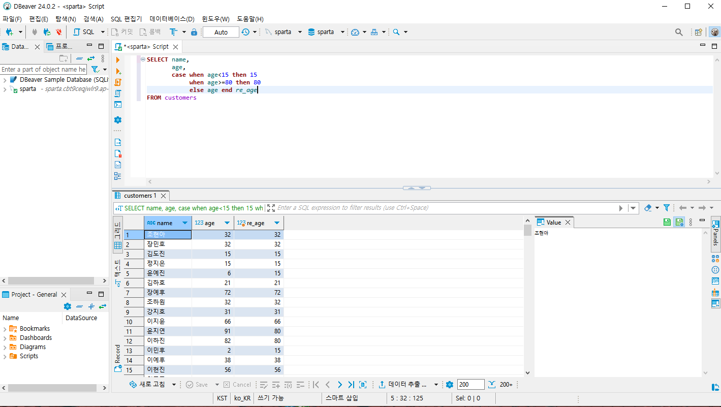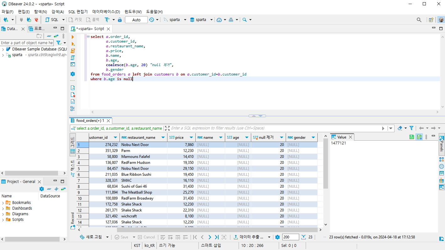 **coalesce(b.age, 20) "null 제거"**: b.age컬럼에 값이 없다면 20으로 대체해줘 그리고 그 컬럼을 "null제거"라고 불러줘