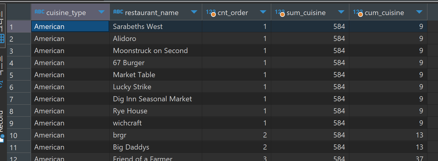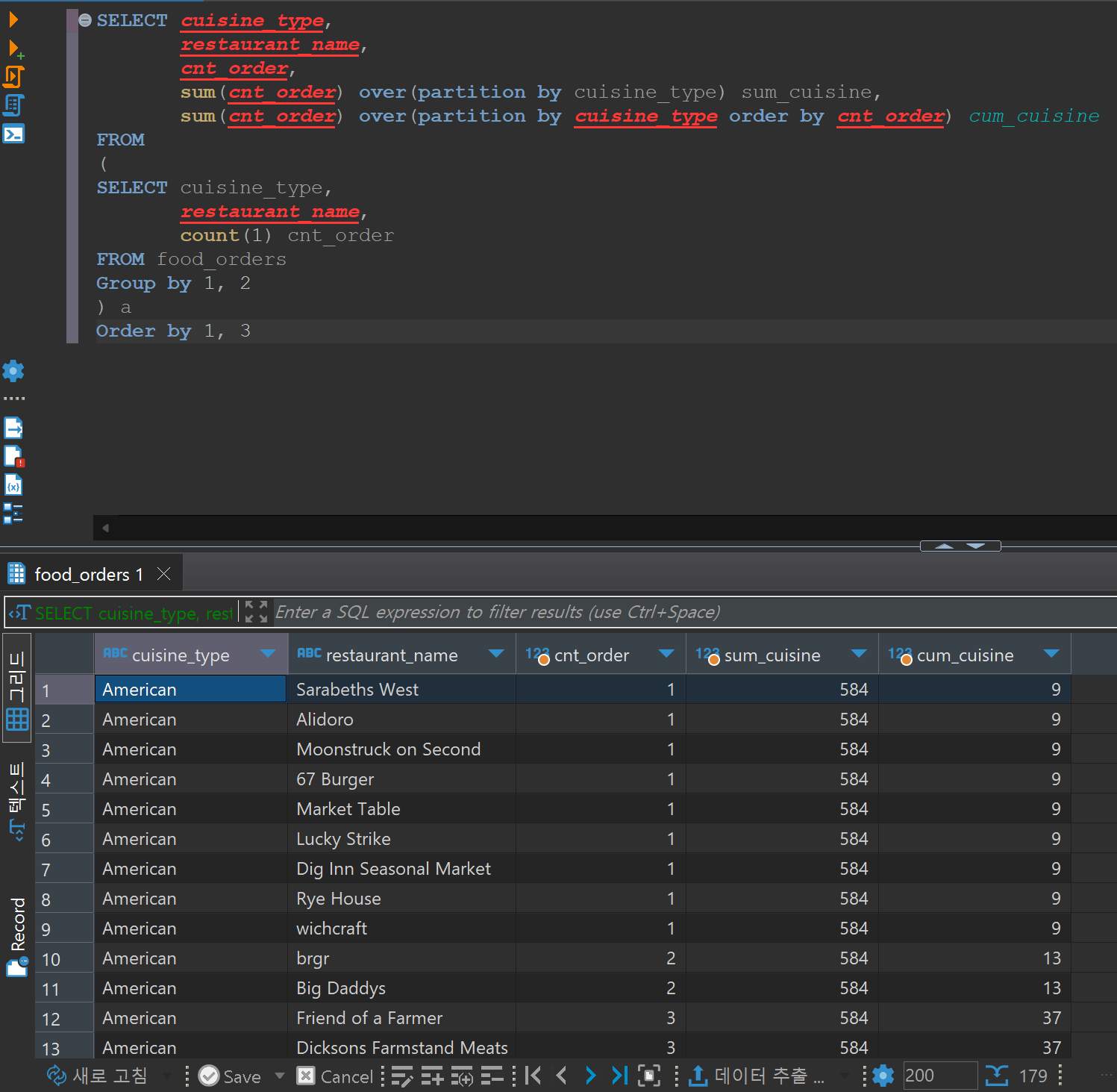 sum(cnt_order) over(partition by cuisine_type order by cnt_order) cum_cuisinesum(주문 건수의 합계를 구할건데) over(음식 종류별로 구해서 order by 순차적으로 더해서 값을 표시해줘) cum_cuisine 이라고 불러줘