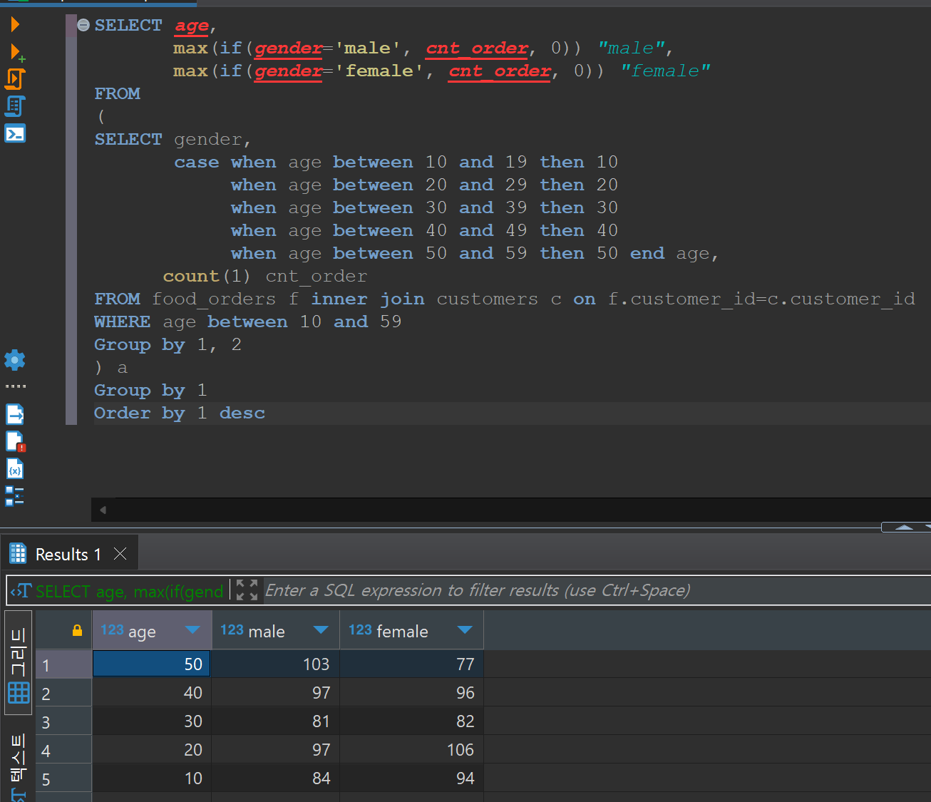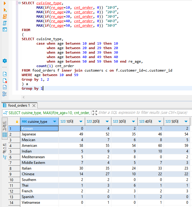 sum(cnt_order) over(partition by cuisine_type) sum_cuisinesum(주문 건수의 합계를 구할거야) over(음식 종류별로 합계를 구해서) sum_cuisine 이라고 불러줘