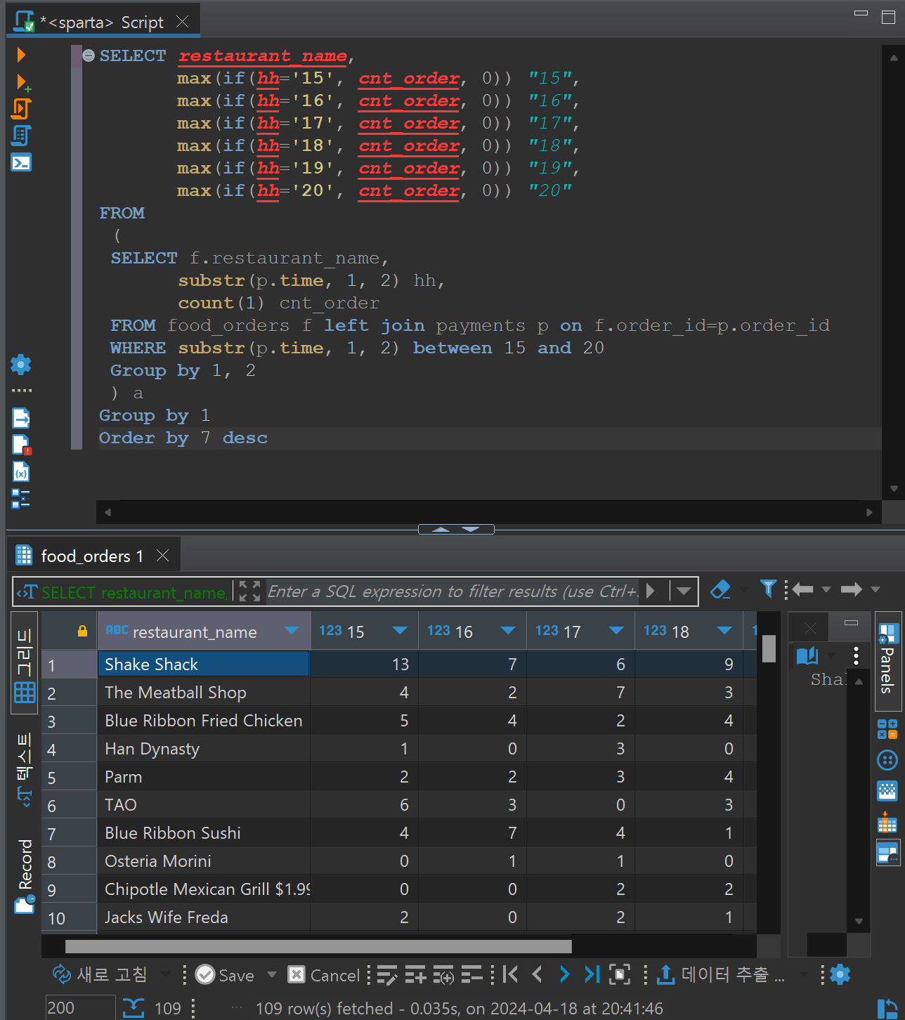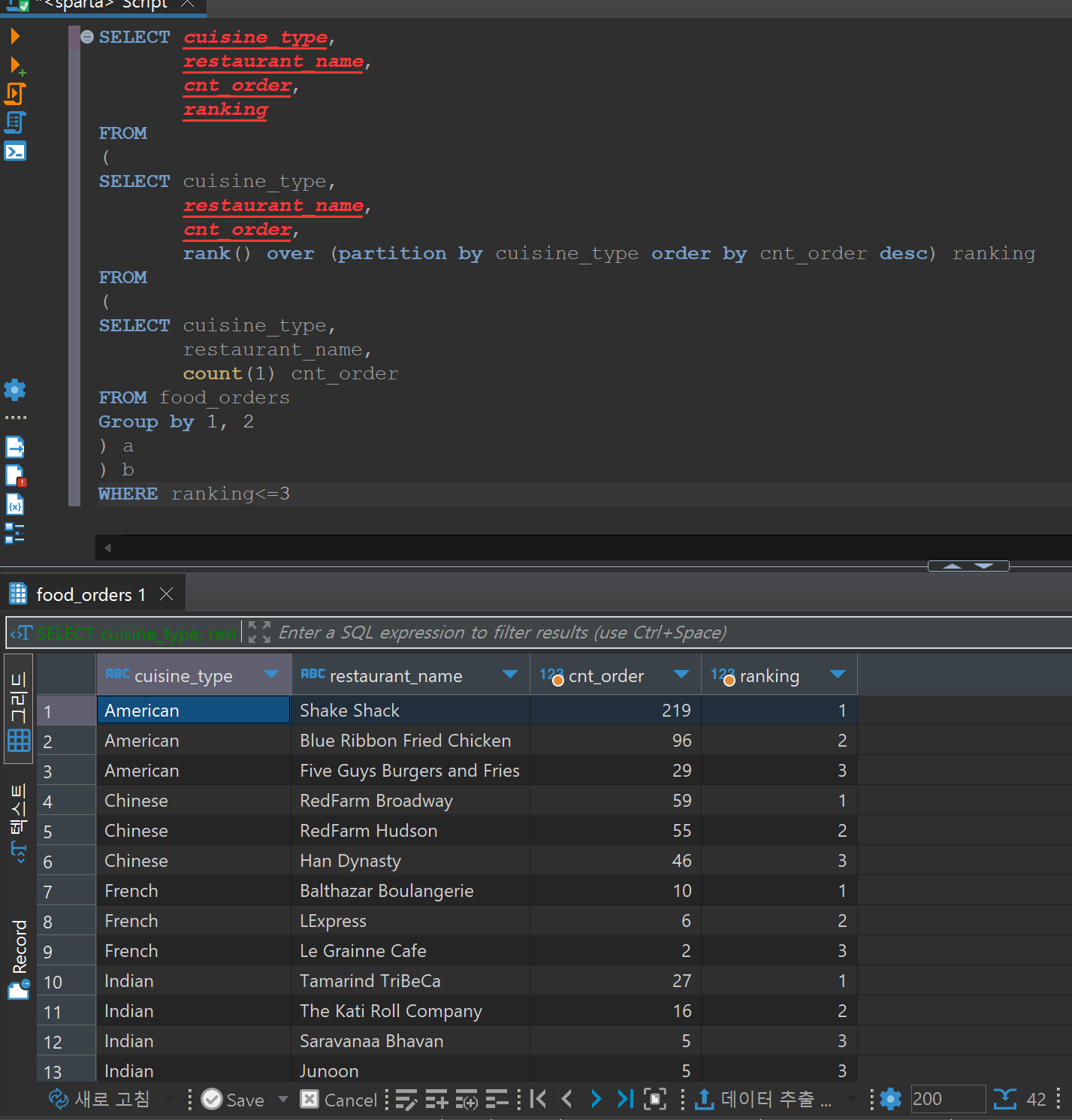 rank() over (partition by cuisine_type order by cnt_order desc) rankingrank() over (partition by 음식 타입별로 랭킹을 구할거야 order by 순위는 음식 종류가 많은 것부터 내림차순으로 매길거야) 랭킹이름은 ranking이라고 불러줘