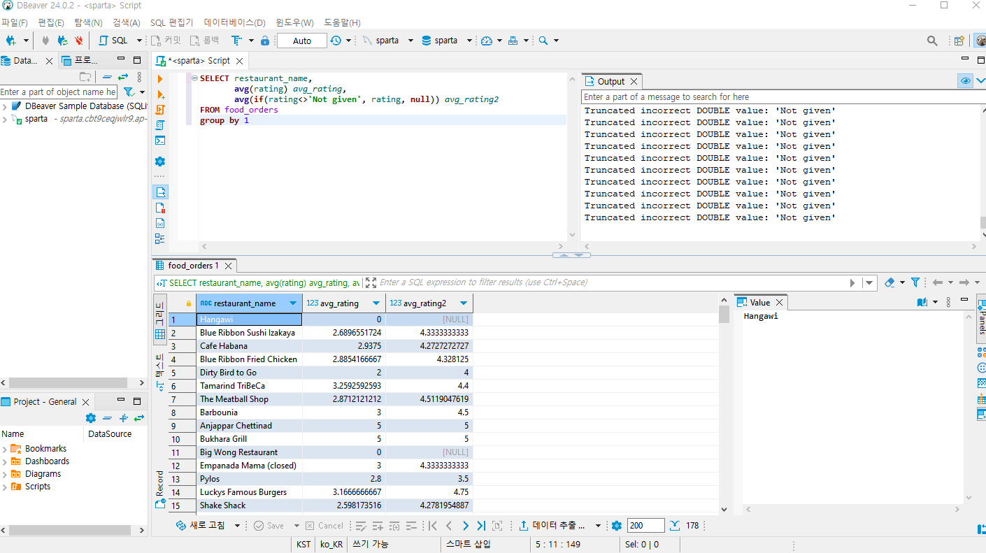 **if(rating<>'Not given', rating, null)**: 만약 rating에 Not given이 없으면 rating값을 그대로 적용하고, 있으면 그 값을 없애줘