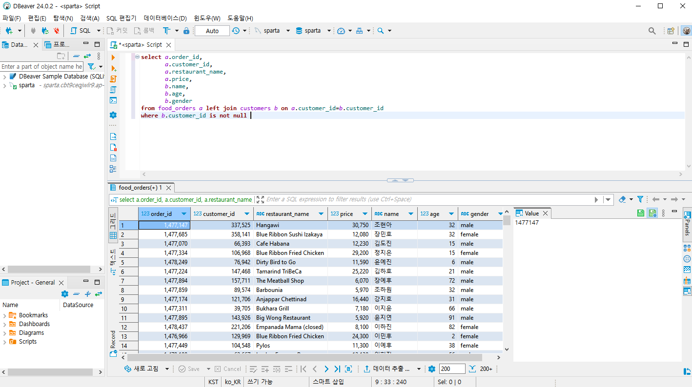 **WHERE b.customer_id is not null**: b.customer_id 컬럼의 빈칸이 아닌 것만 추출해줘