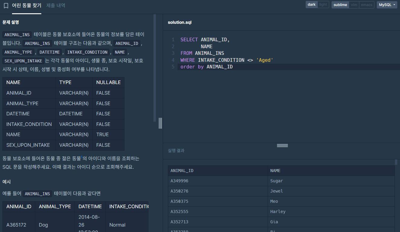 : 'Aged'가 나이가 든 이라는 의미이기 때문에 INTAKE_CONDITION 컬럼에서 Aged가 아닌 데이터들을 추출해야한다. <>를 사용하여 '아닌' 항목을 추출할 수 있다.