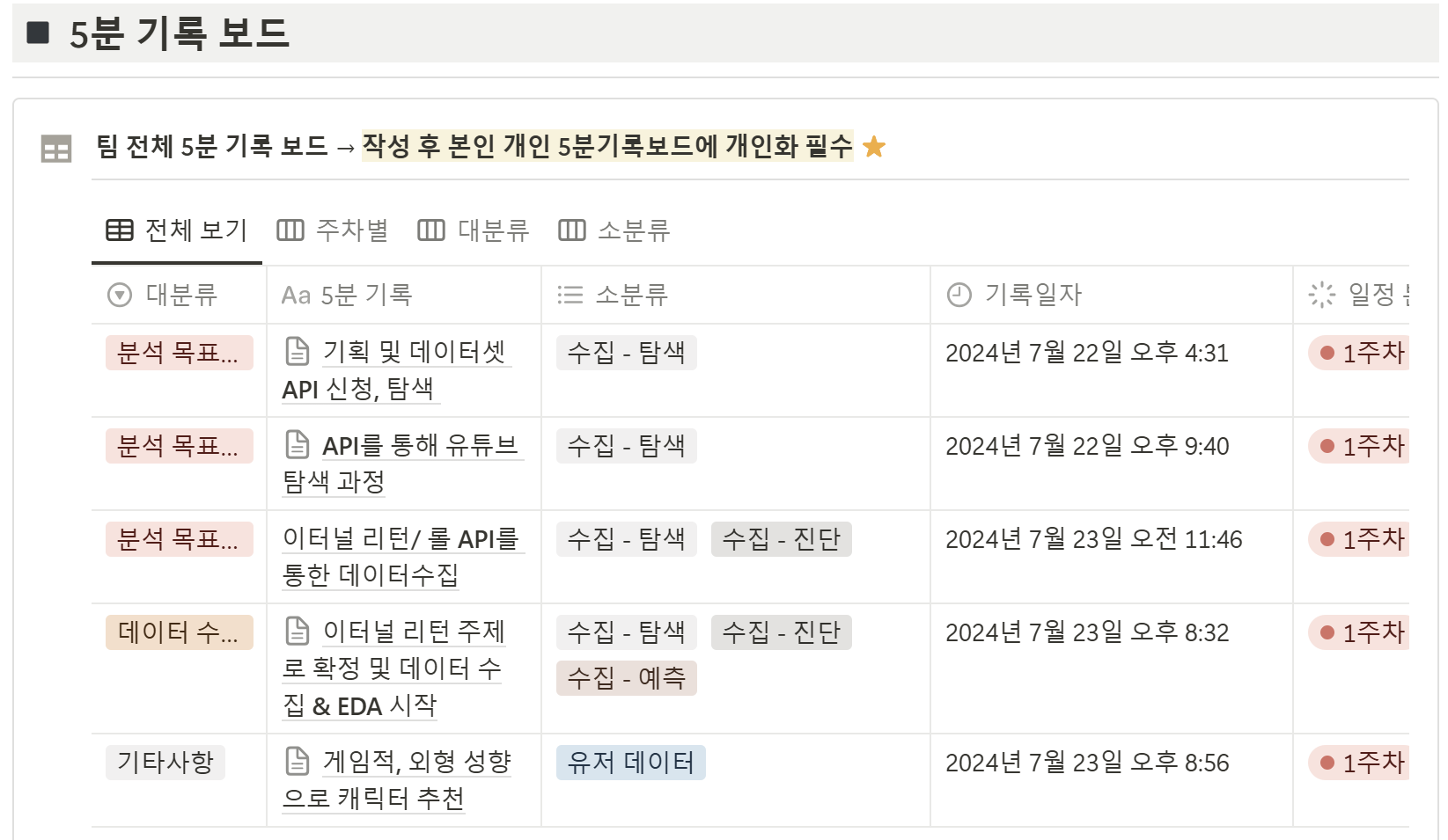 간단하게 프로젝트 진행 상황을 5분 기록보드로 정리했을땐 다음과 같다!