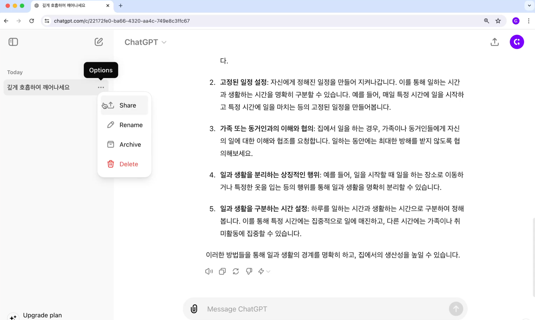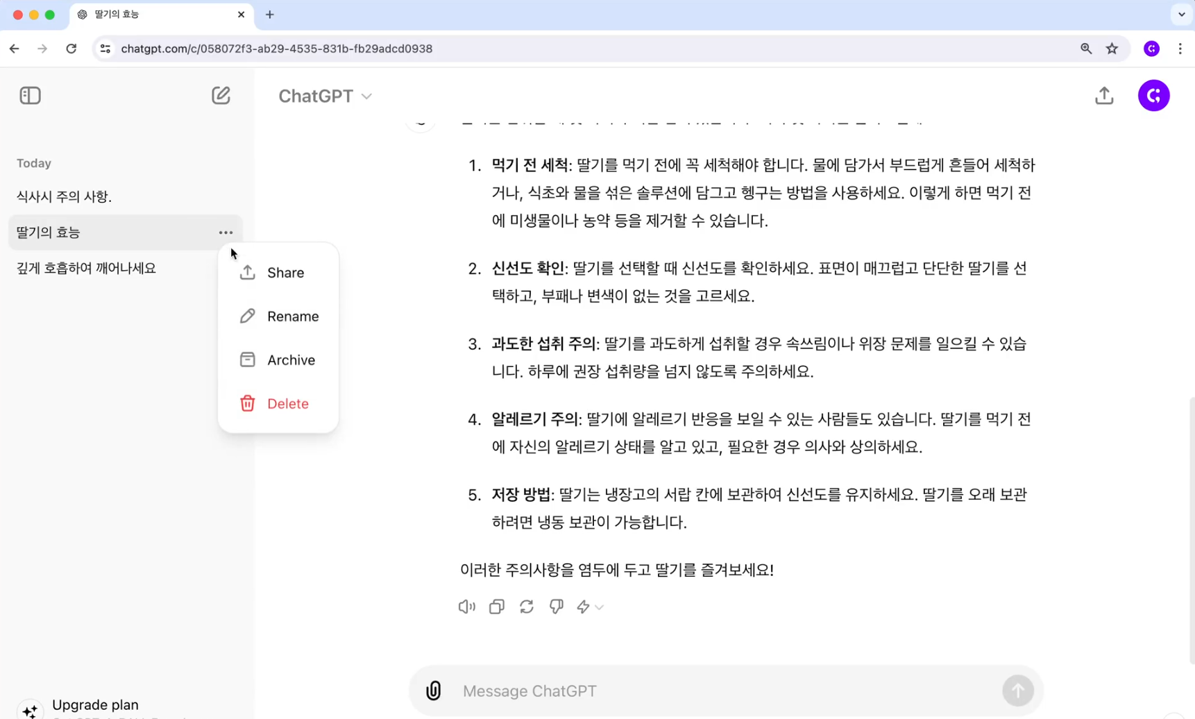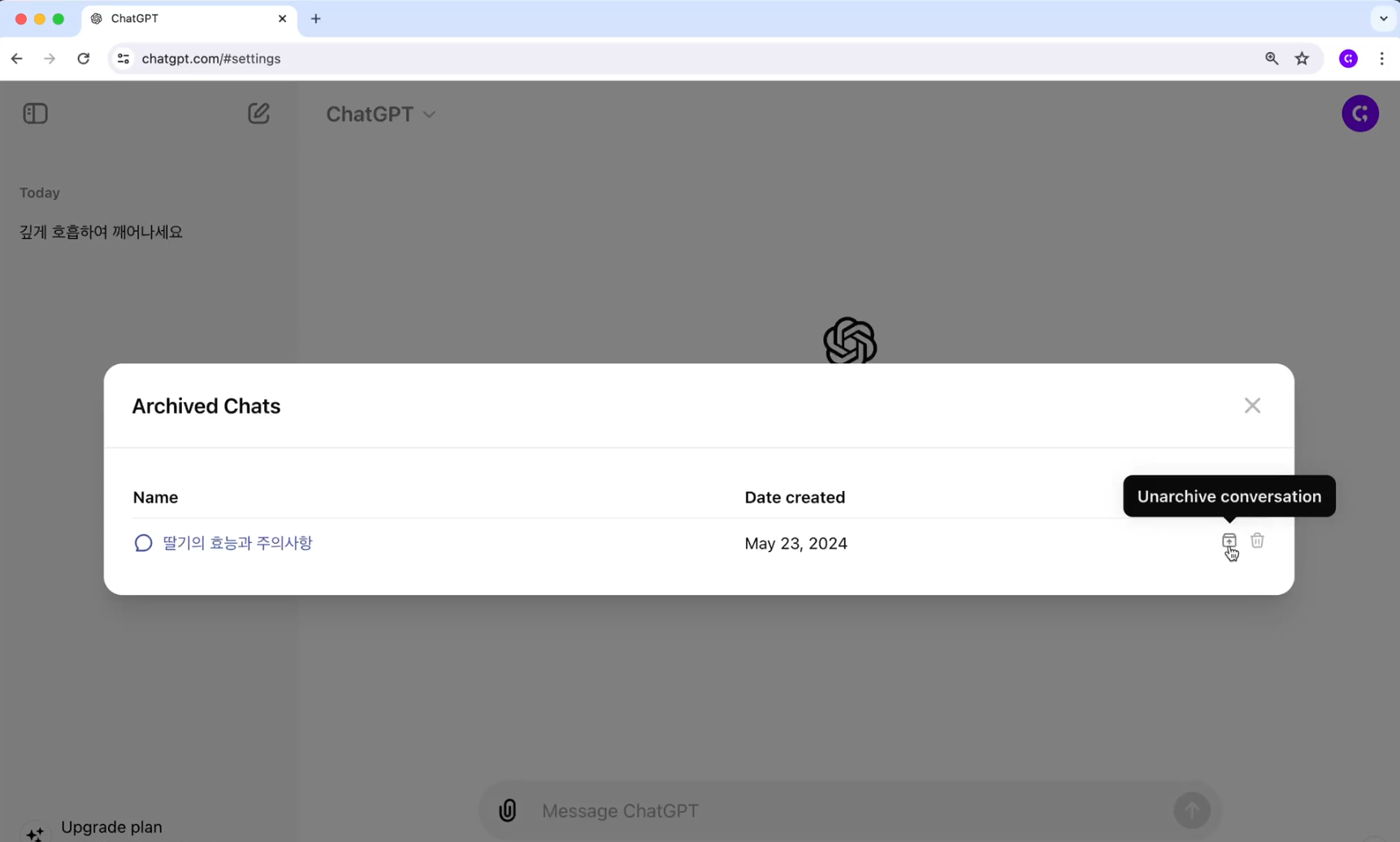 → Archive 버튼을 누르면 채팅창을 지우지 않고도 사이드바에서 숨기고 바로 채팅방이 보관