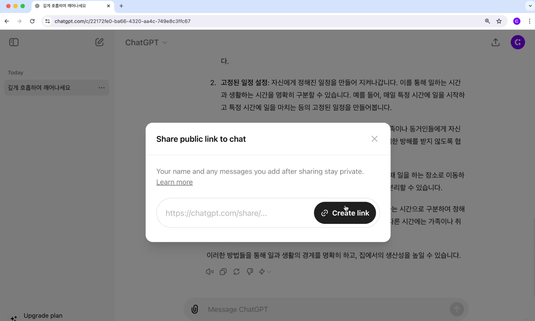 → Share public link to chat 이라는 창이 뜨고, 여기서 Create link 버튼을 눌러 링크를 생성하고