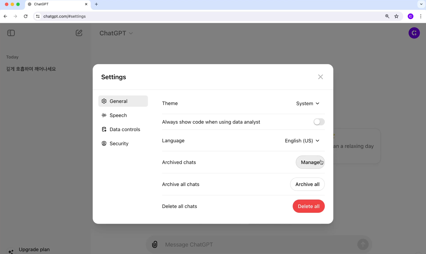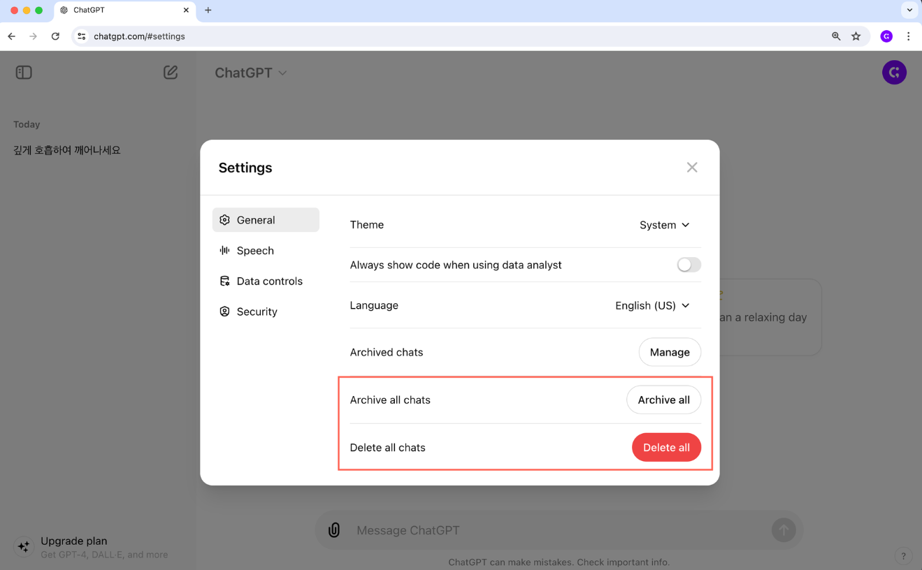 → Delete all chats 항목의 Delete all 버튼은 사이드바에 있는 채팅방은 물론이고 보관해 둔