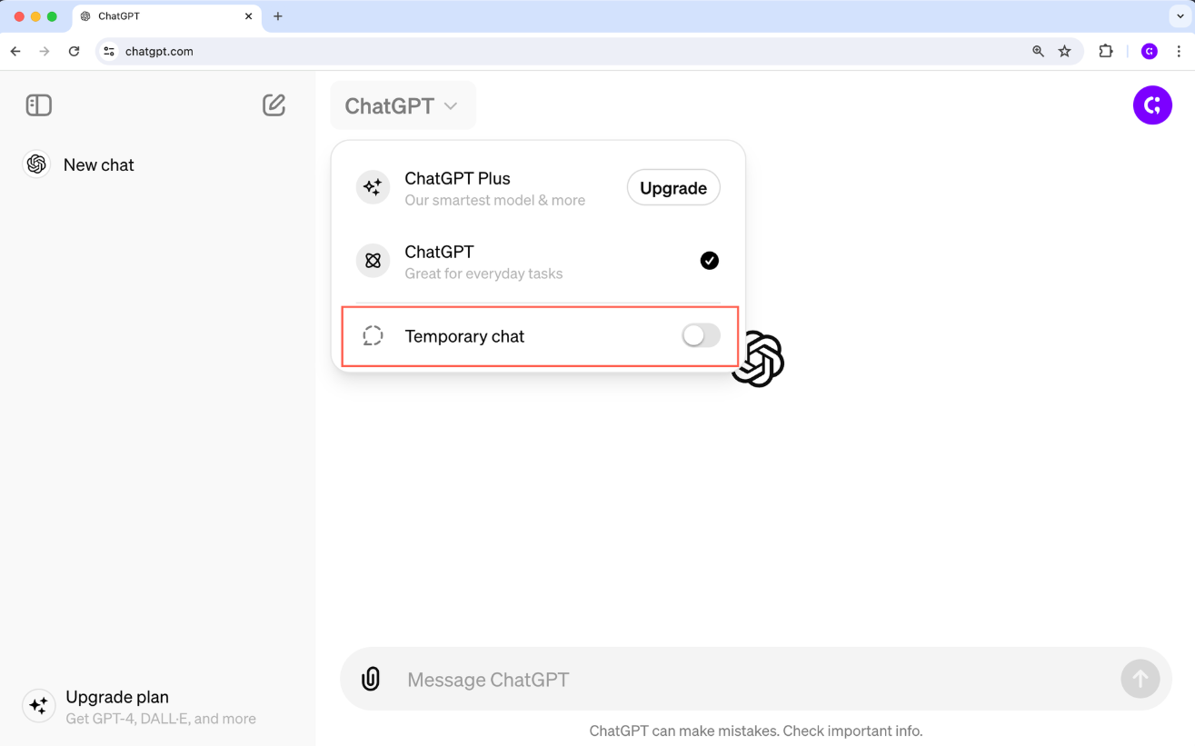 아래쪽에 Temporary chat 항목과 토글 버튼을 켜보면 temporary chat 기능이 활성화되면서