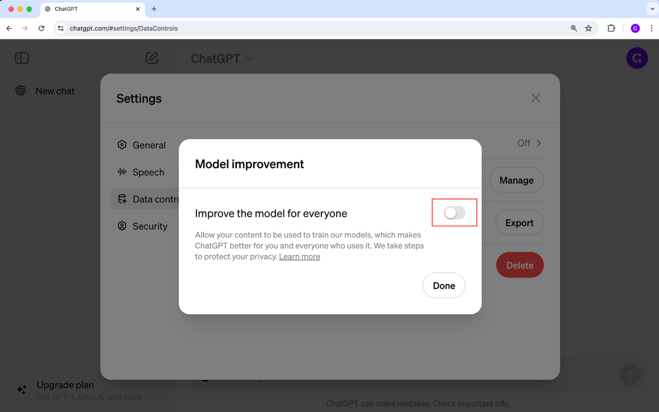 → 여기서 토글 버튼을 끄면 앞으로 챗GPT와 나누는 대화는 모델 학습에 사용되지 않는다.