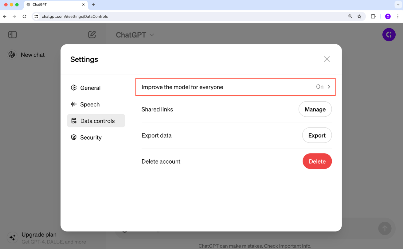 Improve the model for everyone 설정은 기본적으로 활성화되어 있다.